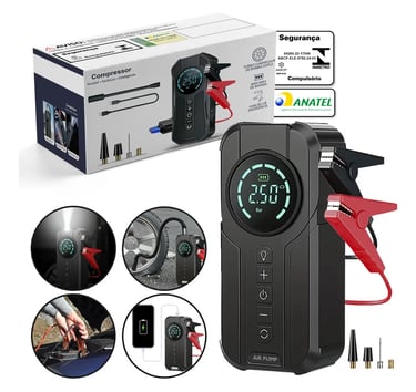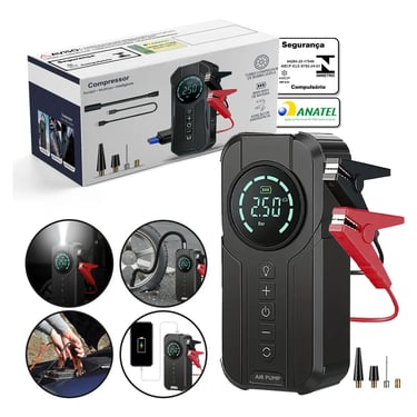 Compressor Ar Portátil Bateria Conector Veicular Bivolt 150 PSI Power Bank e Auxiliar de Partida Mais Lanterna